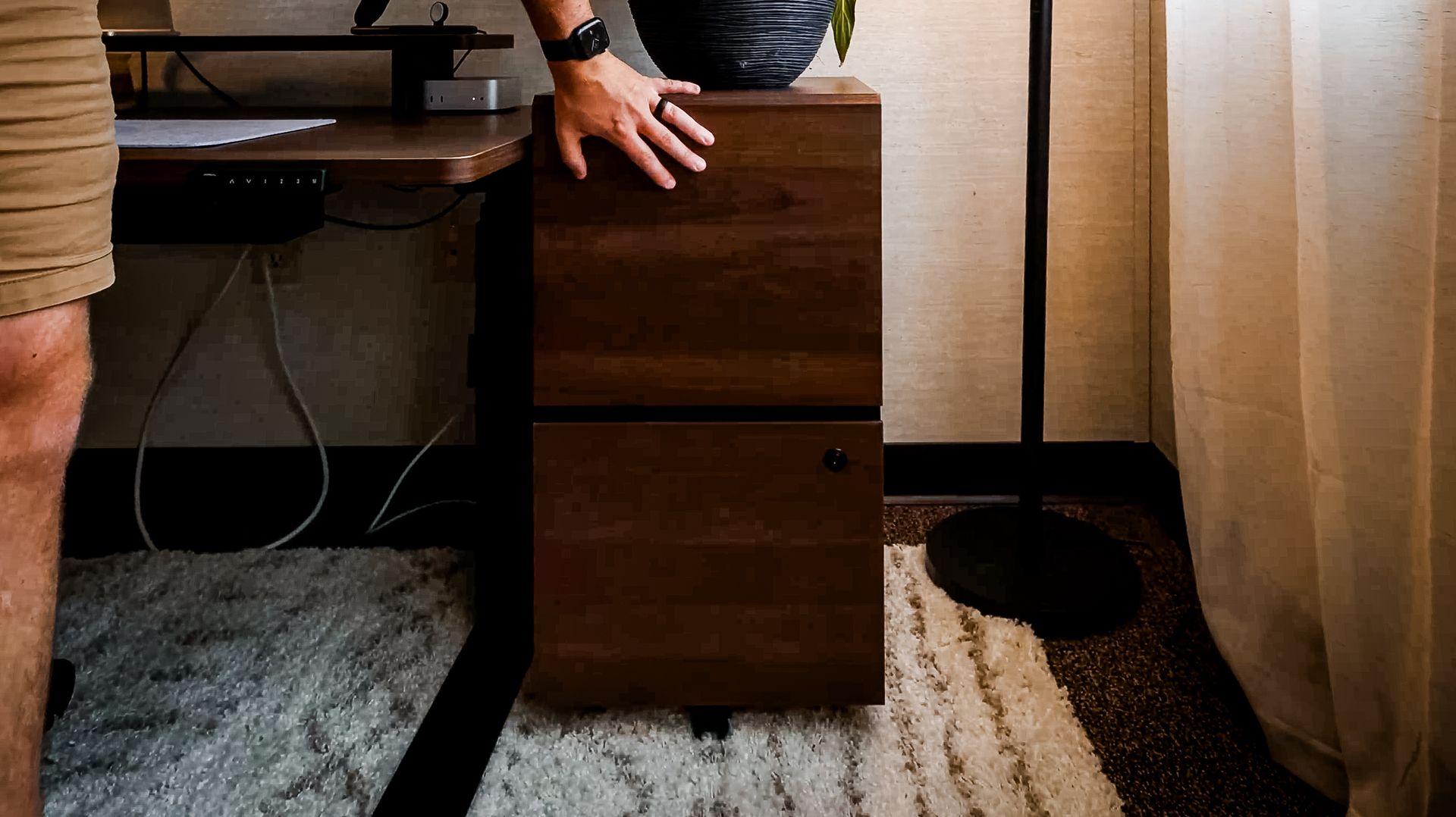 I mentioned the desk earlier, but the setup wouldn't feel complete without the matching filing cabinet. One of the hardest things about building a "Retro Future" space is finding pieces that actually match. Usually, you end up with three different shades of walnut that clash horribly. Since this cabinet is from the same Vernal ecosystem as the desk, the wood grain and finish match perfectly. It adds to that cohesive, furniture-first vibe I wanted for this room. It’s not just a metal box thrown under a table; it feels like a deliberate part of the interior design. Plus, having a physical space to store documents and messy cables helps keep the desktop surface clean and minimalist, which is key for maintaining focus.